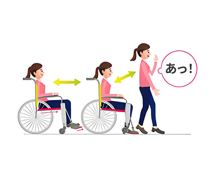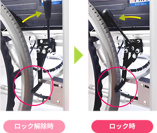 助立さんは、車いす後輪のブレーキをかけた時のみ作動する安全設計です。万が一、動作中にブレーキを外してしまった場合も停止します。また、走行位置以外の座面角度でブレーキを外しても、移動ができないようロックがかかる構造です。