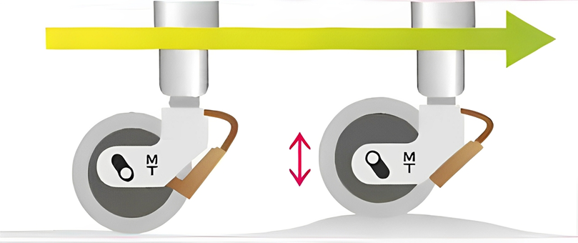 独自開発の板バネ式MTサスペンションキャスターを搭載しています。小さな段差の乗り越えをスムーズにし、凸凹道の衝撃を吸収します。