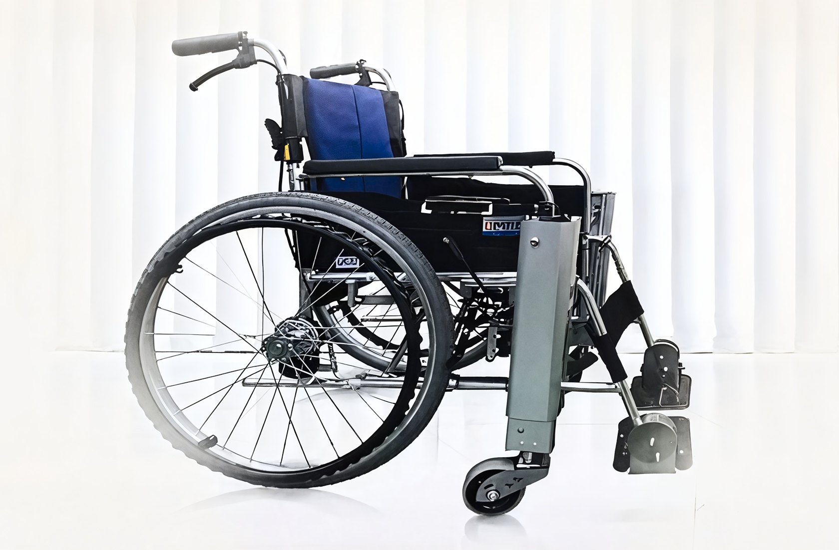 ステップの昇降機能により、乗り降りが簡単にできる車いすです。「乗る」「降りる」「歩き出す」といった動作をサポートします。